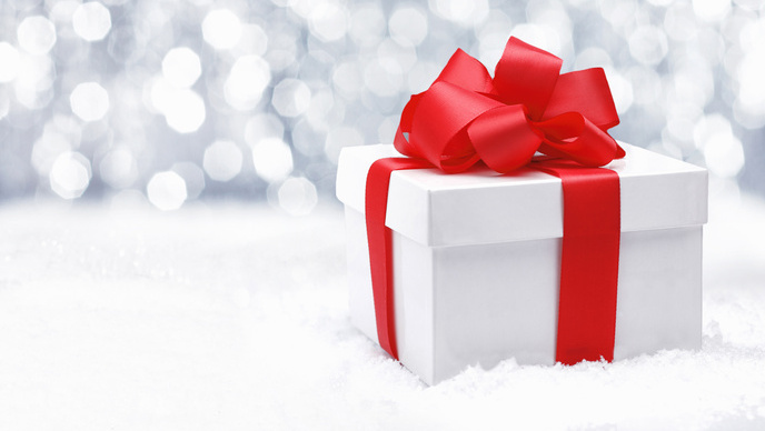 Decorative white gift box with a large red bow standing in fresh snow against a background bokeh of twinkling party lights