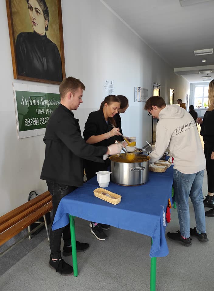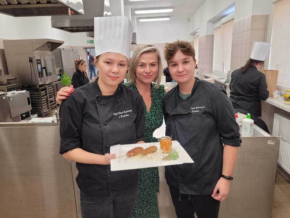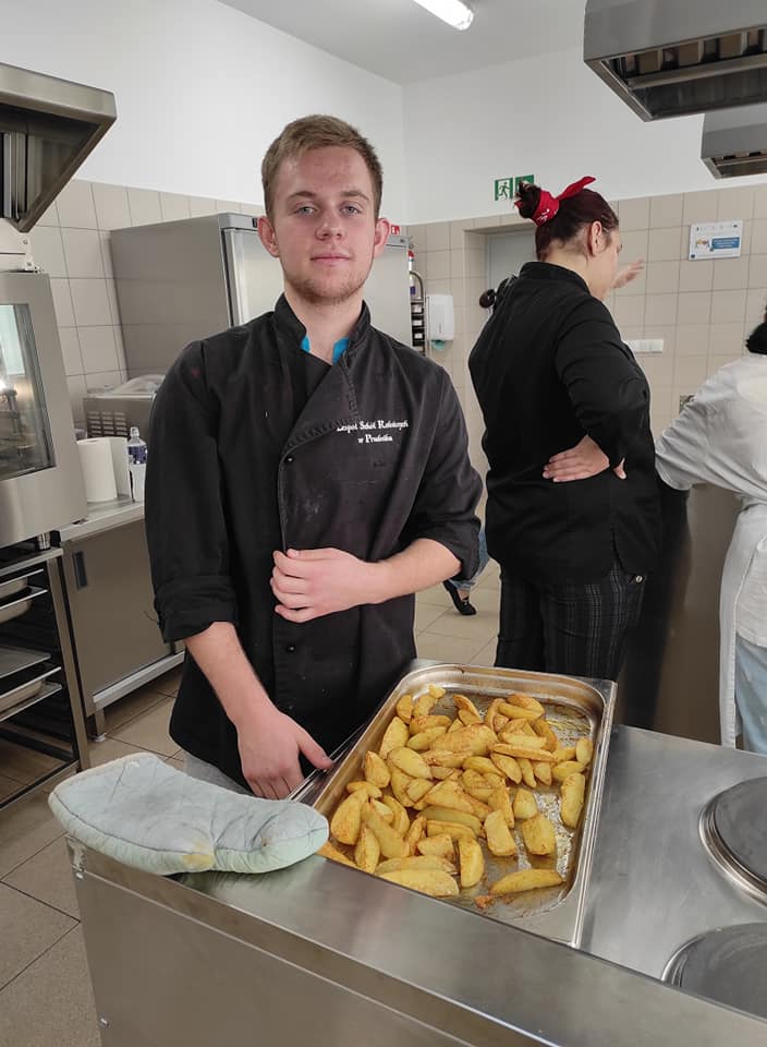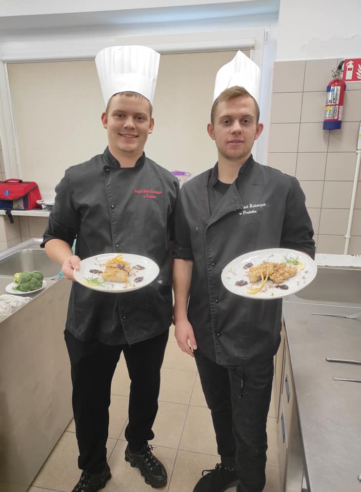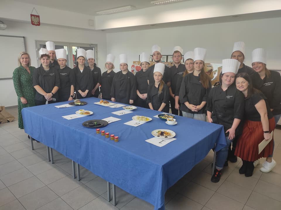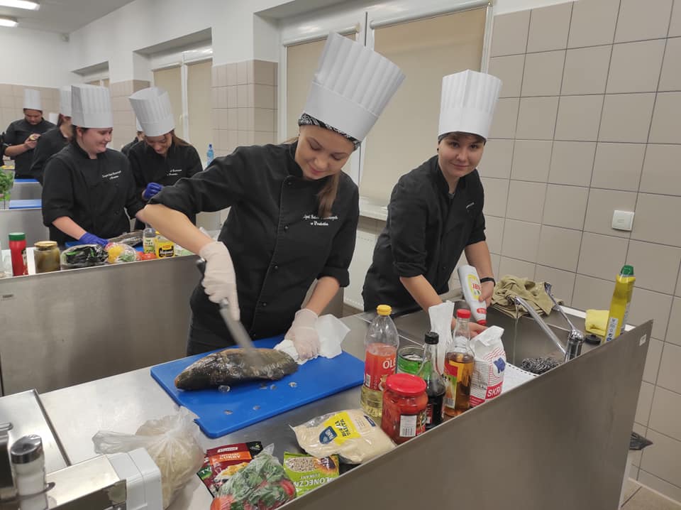 Czwartek był dniem szczególnym dla przyszłych szefów kuchni. Uczniowie klas branży gastronomicznej w dwuosobowych zespołach przystąpili do konkursu „Starcia kulinarne z karpiem w roli głównej”. Ich zadaniem było przyrządzenie dania z karpia, którego udało się pozyskać dzięki współpracy z Rybacką Lokalną Grupą Działania „Opolszczyzna”. Wykonane dania były na bardzo wysokim poziomie, kilka z nich mogłoby zagościć w kartach menu restauracji. Jury w składzie: p. Beata Szczepańska- właściciel hotelu i restauracji, p- Waldemar Małota- szef kuchni, p. Marek Adamus- przedstawiciel RLGD”Opolszczyzna” oraz p. Małgorzata Kijora-Mormul- wicedyrektor szkoły wyłonili laureatów: I miejsce- Wiktoria Benroth i Julia Kopka z klasy 3TEG za „Kofty rybne z sosem słodko kwaśnym na chrupiącym makaronie ryżowym” II miejsce- Karina Temczyszyn i Anastazja Różańska z klasy 3TGM za „ Czarne pierogi z azjatyckim nadzieniem z karpia” III miejsce- Milena Niewiadomska i Zosia Misa z klasy 3TGM za „Karpioburgery” IV miejsce- Oliwia Kosińska i Konrad Ryszka z klasy 3 TEG za „ Maślanego karpia na puree z pietruszki” Ponadto p. Waldemar Małota przyznał indywidualne wyróżnienie za charyzmę kucharską Wiktorii Benroth. W piątek odbył się Dzień Pieczonego Ziemniaka, wszyscy uczniowie szkoły mogli degustować pieczone ziemniaczki podawane z sosem czosnkowym.