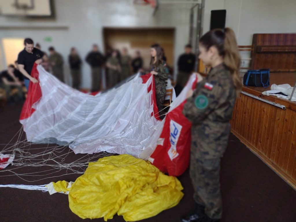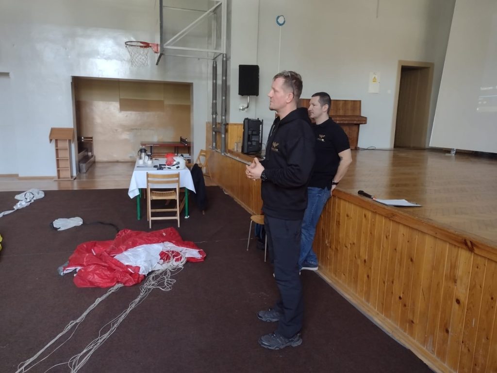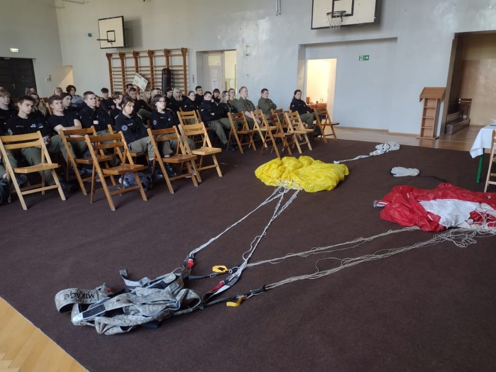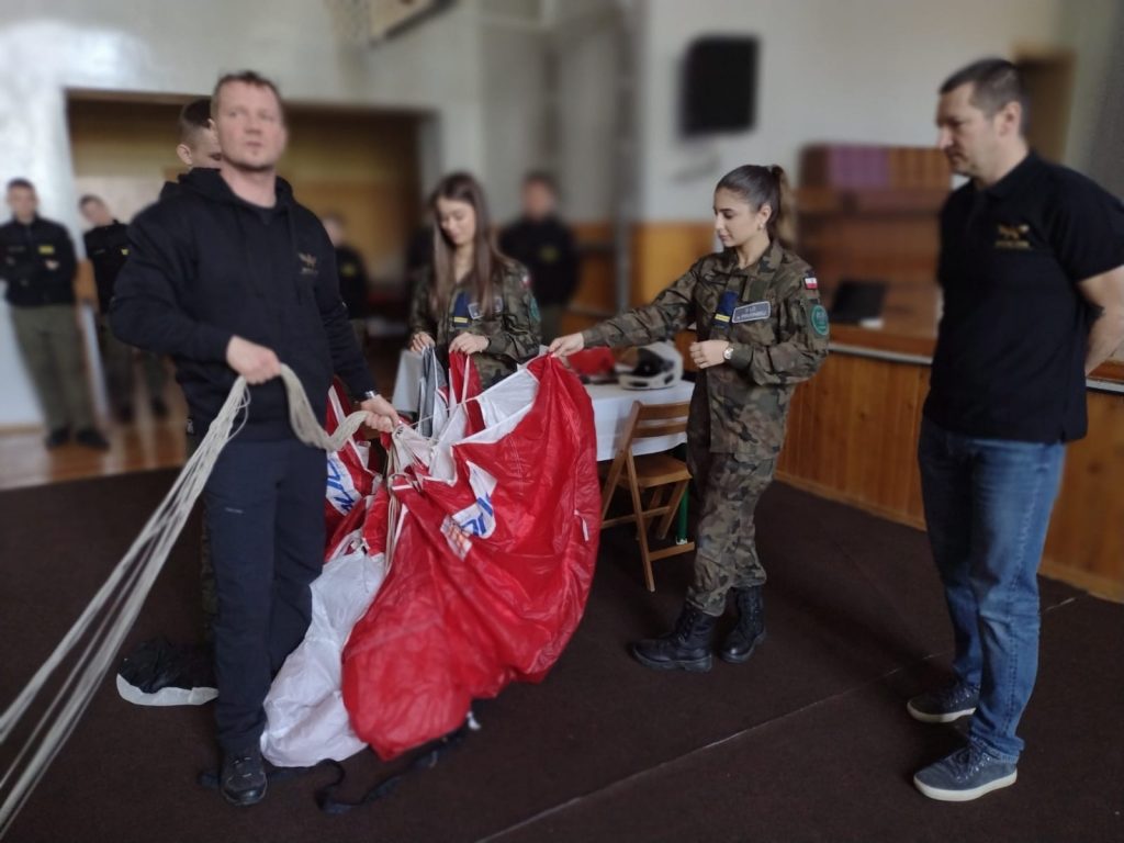 Szkolenie spadochronowe W środę 13.04.2022 na 4,5 lekcji w hali sportowej LO odbyło się spotkanie z instruktorami skoków spadochronowych, którzy zaprezentowali ten piękny sport oraz ofertę szkolenia Static Line w AVIACOM PROJEKT dla klas mundurowych. 2022-04-13 Katarzyna Bochenek