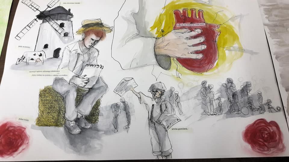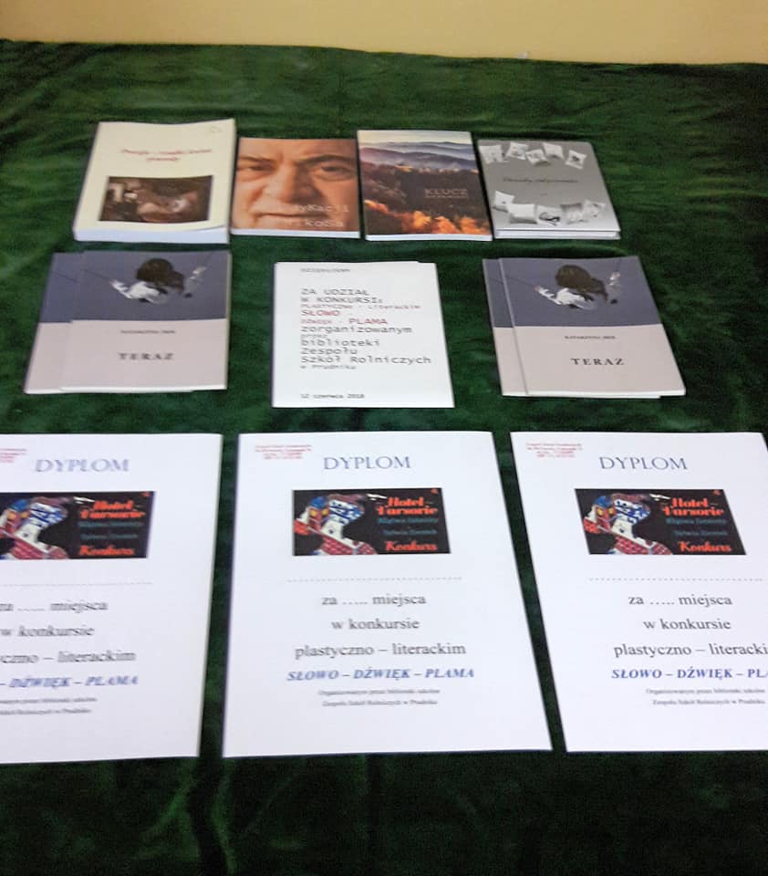 Niezmordowana animatorka kultury i czytelnictwa, Pani Barbara Maryszewska (fot.1) zorganizowała w bibliotece szkolnej 12 czerwca 2018 V edycję konkursu literacko – plastycznego Słowo – Dźwięk – Plama. Tym razem uczestnicy wykonali prace do fragmentu książki autorstwa Sylwii Zientek Hotel Varsovia. Klątwa lutnisty.