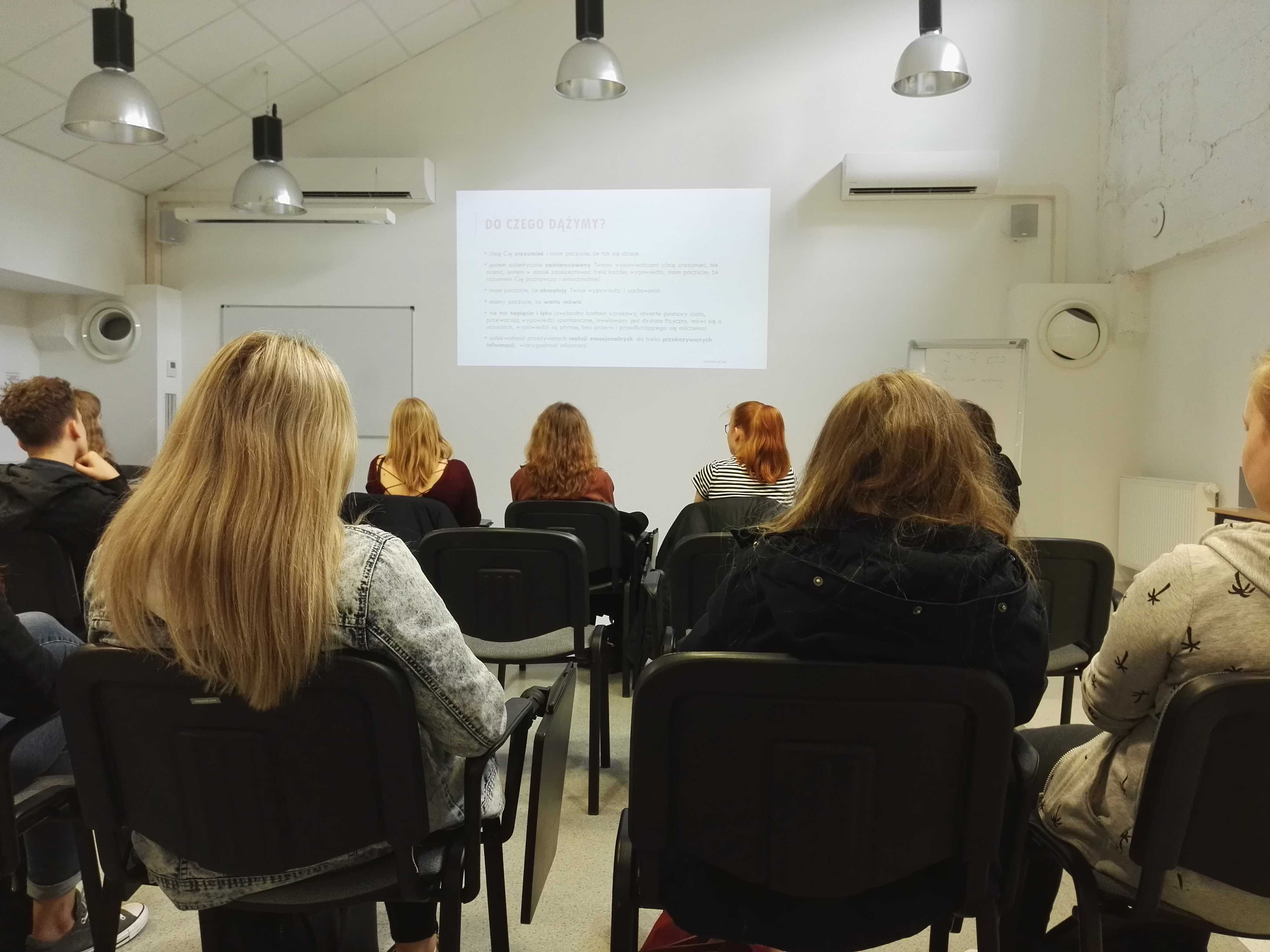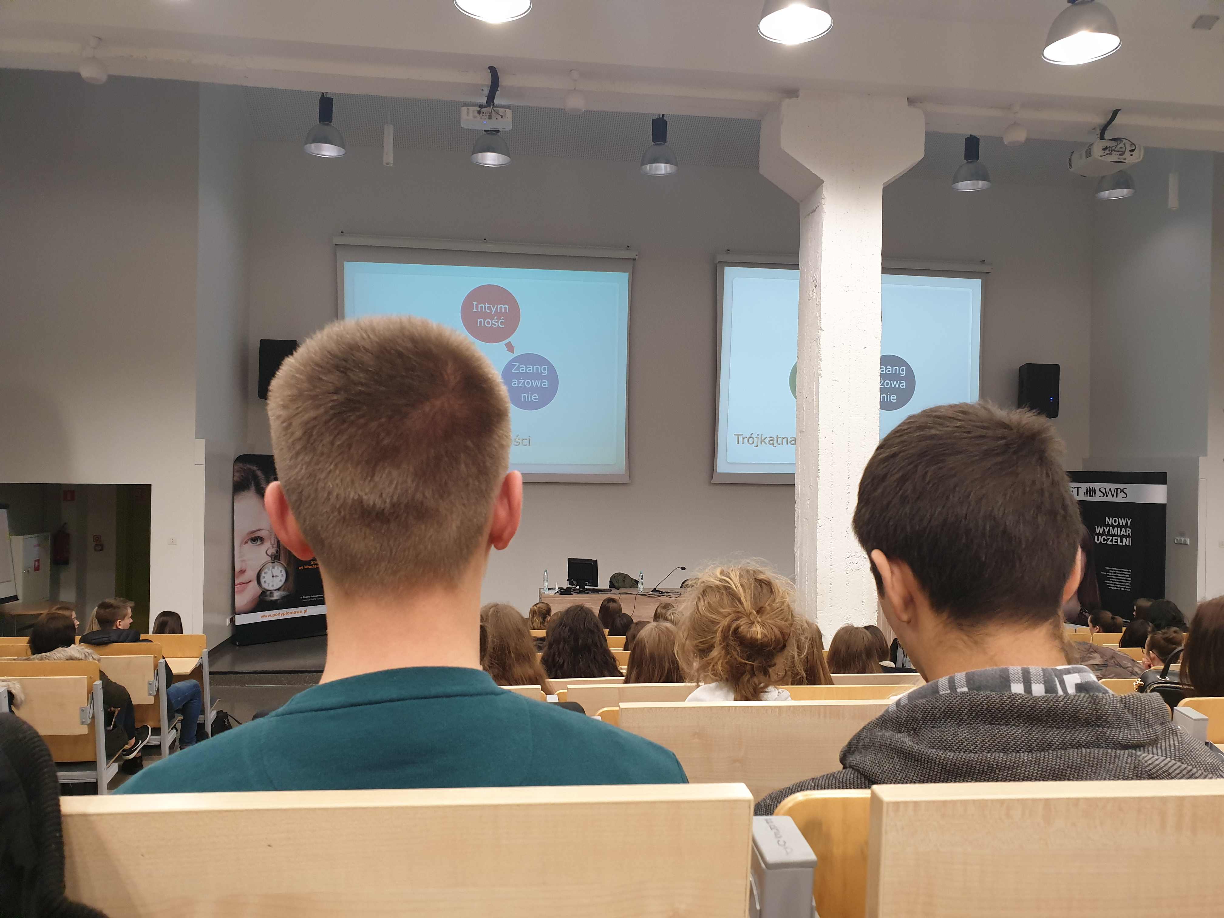 Wizyta rozpoczęła się wykładem na temat „Wczesne związki partnerskie w okresie dorastania”, który poprowadził Michał Pozdał – specjalista do spraw profilaktyki społecznej, przemocy, dyskryminacji oraz różnorodnych problemów społecznych. Ponadto jest on członkiem międzynarodowej organizacji European Aids Treatment Group. Podczas wykładu dowiedzieliśmy się o różnicy między zakochaniem, a miłością. Zakochanie jest zazwyczaj krótkotrwałe, czujemy wtedy „motylki w brzuchu”, rozkojarzenie, oczarowanie drugą osoba i może to trwać do momentu zawiązania kolejnej znajomości. Jednak jeżeli to trwa o wiele dłużej, bez względu na kolejne znajomości, to wtedy uczucie to przeradza się w miłość, które jest dojrzalsze i może na całe życie.